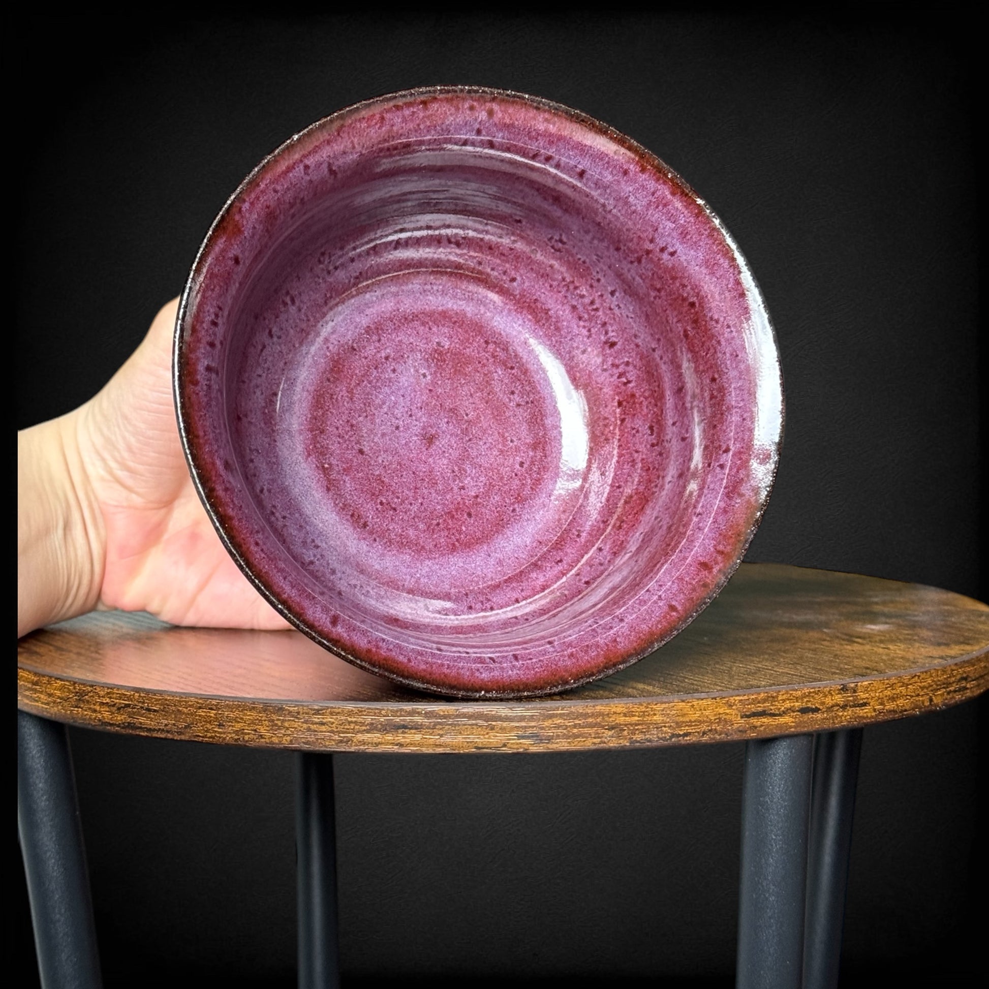 This bowl features a rich and warm palette centered around shades of deep rose and soft magenta. The glaze transitions from a darker, almost burgundy tone near the rim into a soft blend of dusty pinks and lavenders across the body.