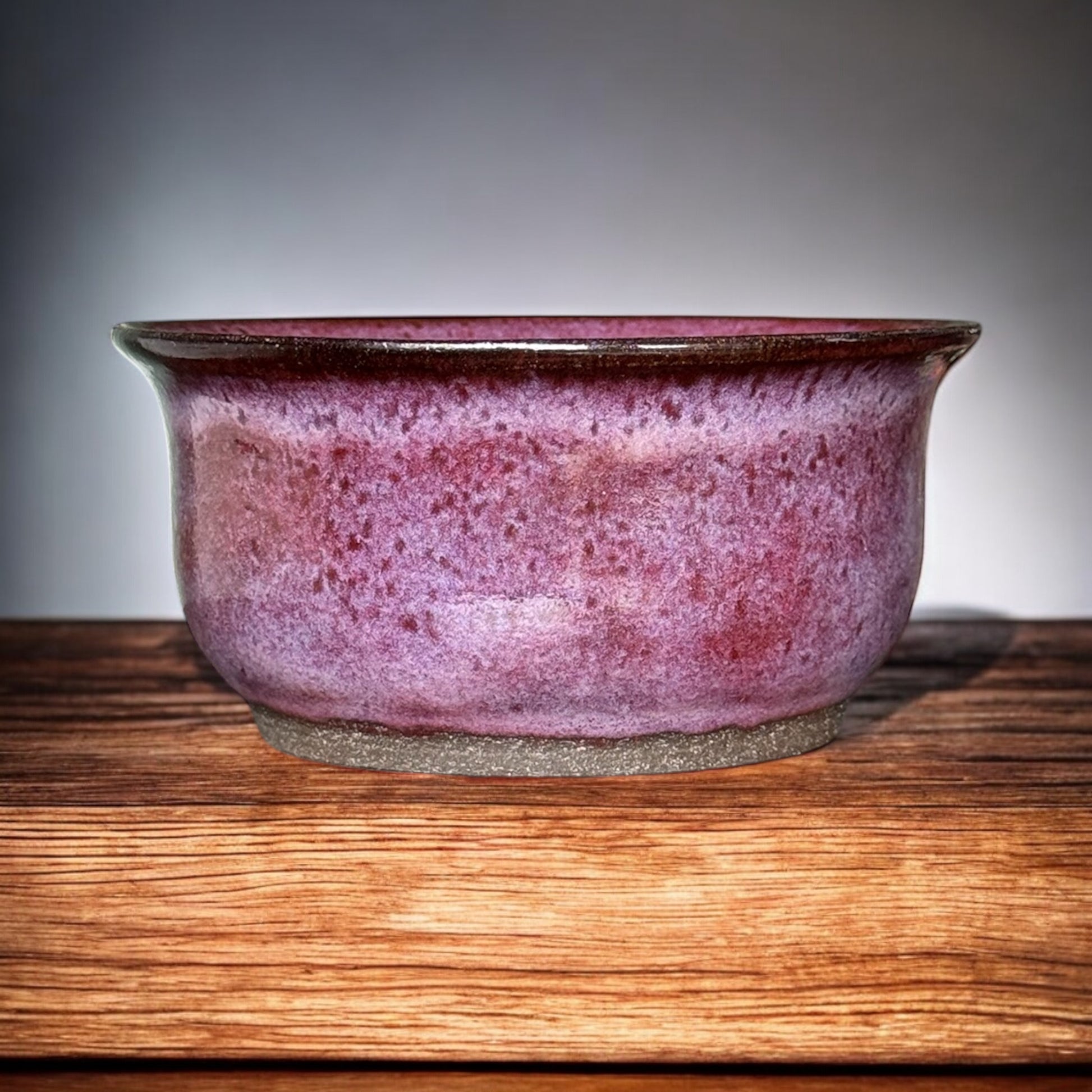 There are subtle speckles and cloudy textures that give it depth and a velvety appearance. The unglazed base has a natural, sandy beige tone, adding an earthy contrast to the otherwise vibrant and romantic coloring.
